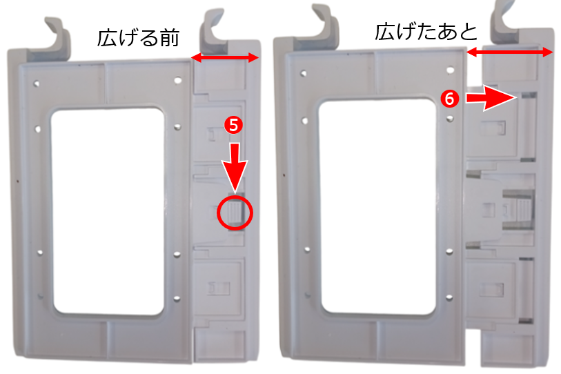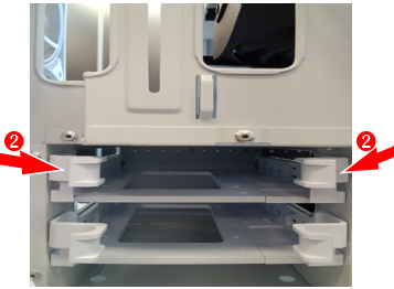 5. 3.5/2.5 インチトレイの側板を横に広げてストレージを取り付けます。