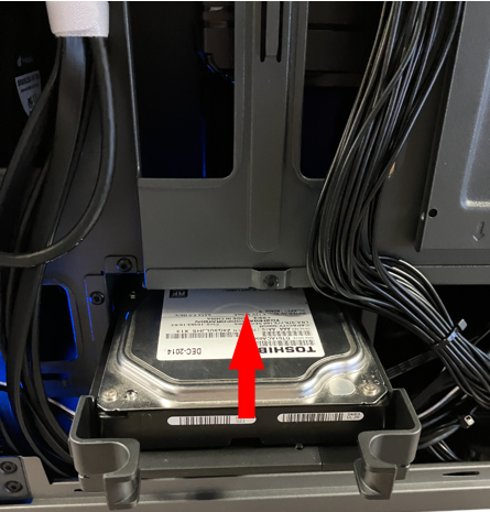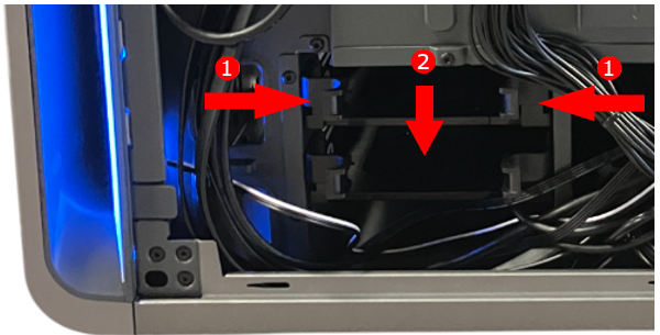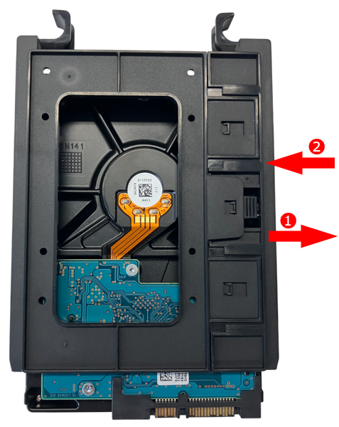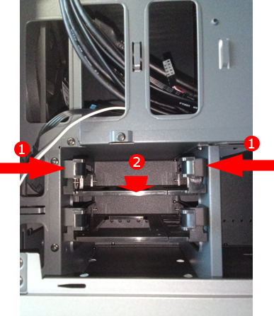 4. 3.5/2.5 インチ ストレージ マウンターをシャーシ内に矢印方向に押し込みます。