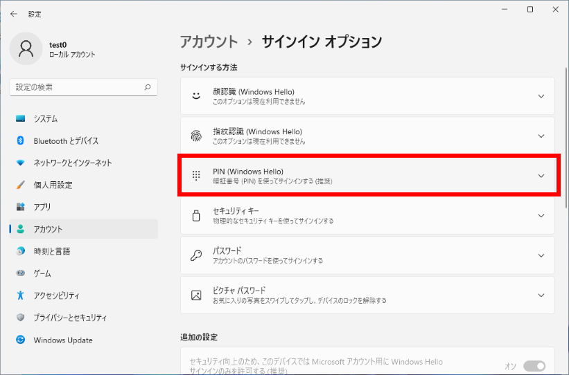 パスワードの代わりに暗証番号 ( PIN ) を設定する方法 > Windows 11