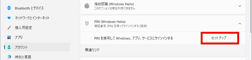 4. 「 PIN ( Windows Hello ) 」 欄 [ セットアップ ] をクリックします。