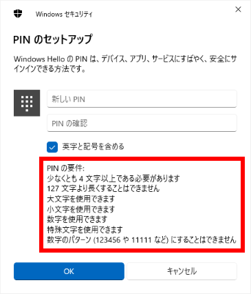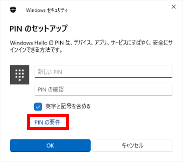 2. 使用可能な文字列を確認するため、 [ PIN の要件 ] をクリックします。