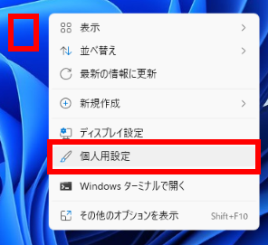 1. デスクトップの何もないところで右クリックし、表示されたメニューから [ 個人用設定(R) ] を