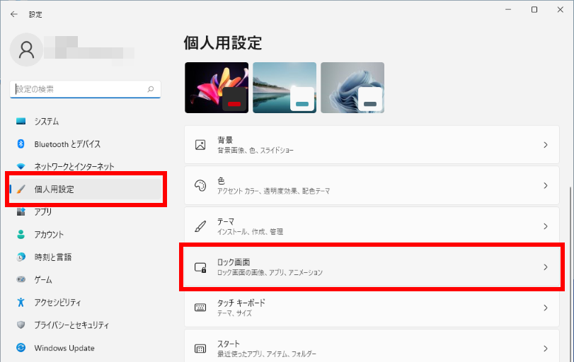3. 「 個人用設定 > ロック画面 」 が表示されます。
