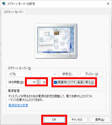 スクリーンセーバーの設定では、スクリーンセーバーから復帰したときにサインインの画面が表示されるように