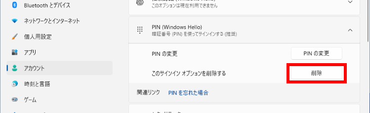 4. 「 このサインイン オプションを削除する 」 欄 [ 削除 ] をクリックします。