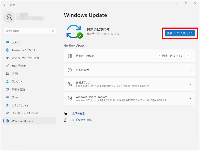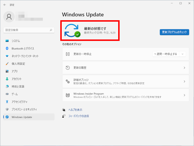 更新プログラムが見つからなかった場合、「最新の状態です」と表示されます。