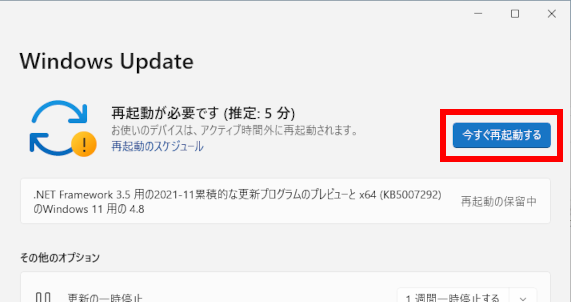 再起動が促されたら、そのまま再起動するか、[ 今すぐ再起動する ] をクリックします。