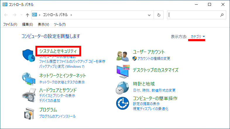 表示方法が 「 カテゴリ 」 になっていることを確認し、[ システムとセキュリティ ] をクリックします。