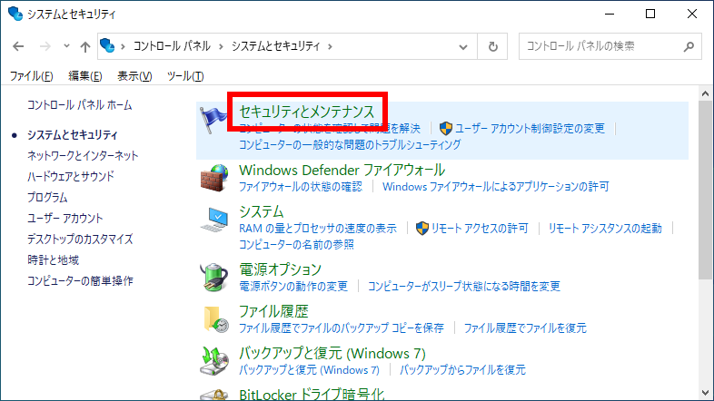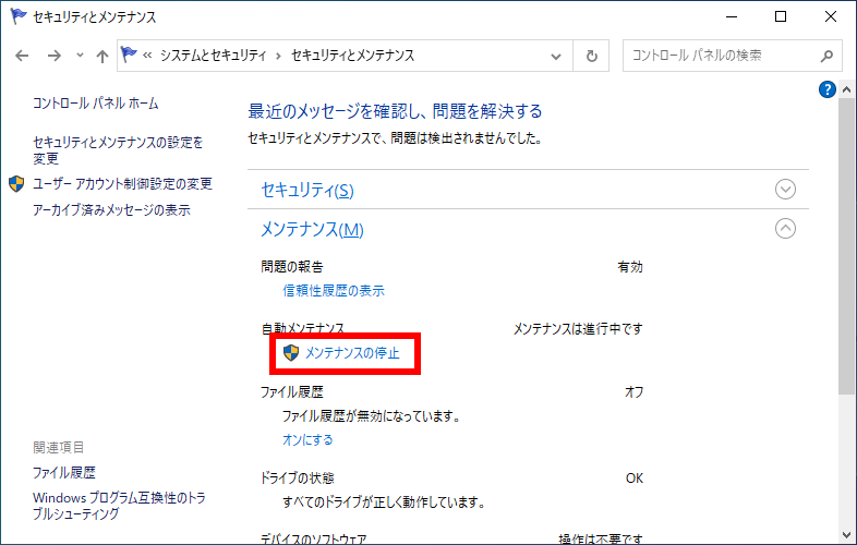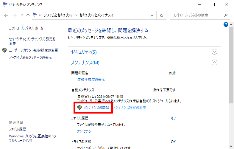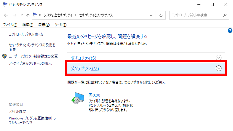 「 セキュリティとメンテナンス 」 に戻るので、[ メンテナンス (M) ] をクリックします。