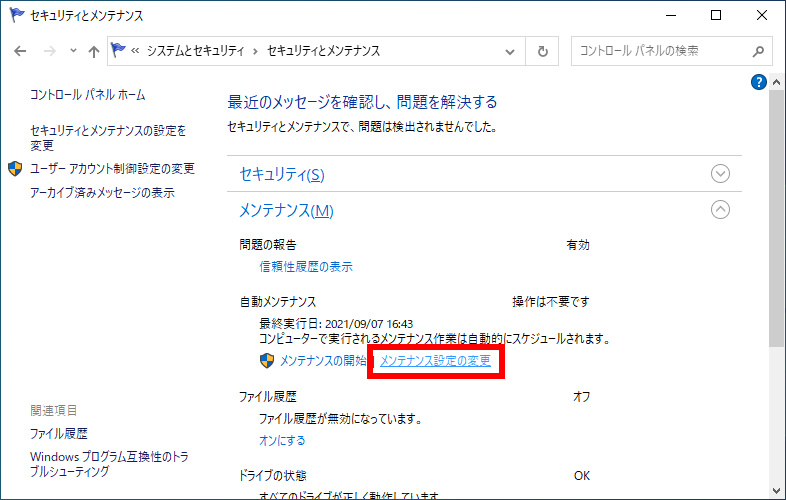 表示された 「 自動メンテナンス 」 欄の [ メンテナンス設定の変更 ] をクリックします。