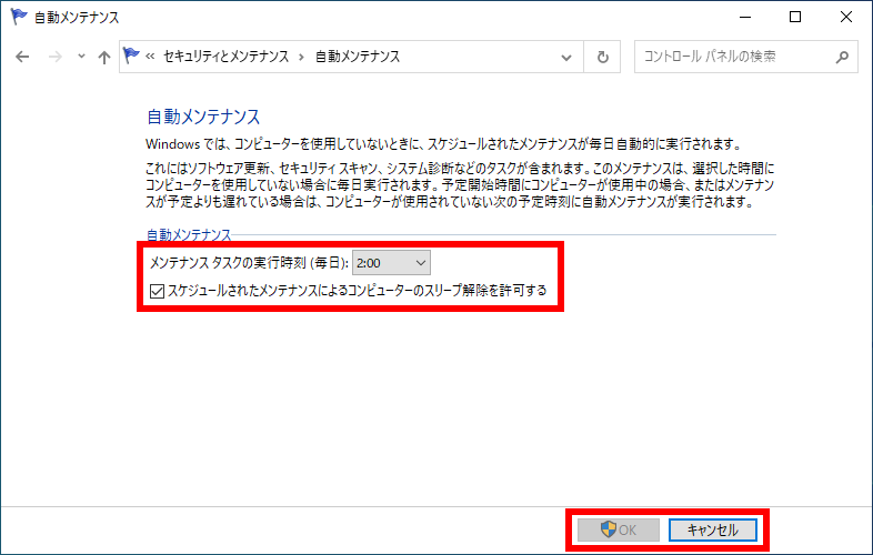「 自動メンテナンス 」 が表示されたら、メンテナンス設定を確認または変更して、[ OK ] または [ キャンセル ] をクリックします。