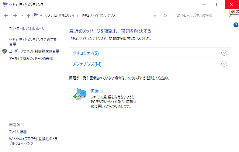 「 セキュリティとメンテナンス 」 に戻るので、右上の [ × ] をクリックし画面を閉じます。