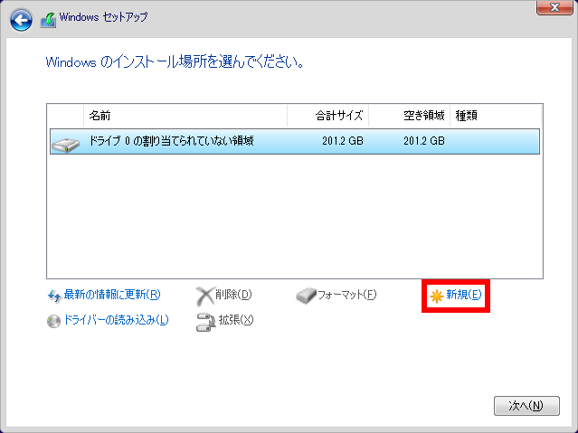 ドライブを複数のパーティションに分割してインストールする場合には 「 新規 (E) 」 をクリックします。