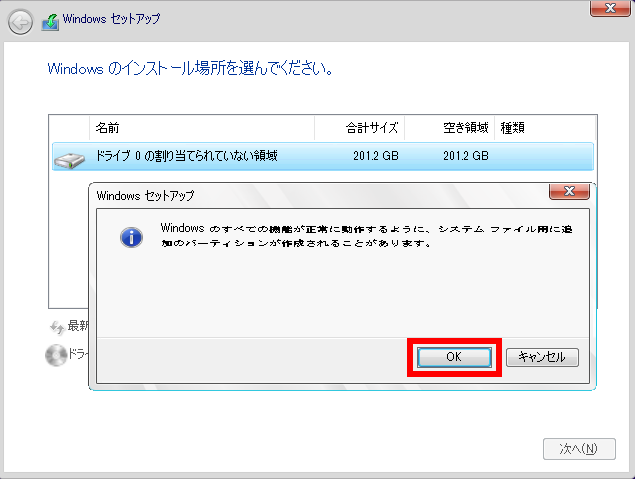 システム ファイル用に新しいパーティションを作成する旨の注意喚起が表示されます。