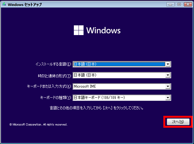 3. 起動完了後、「 Windows セットアップ 」 画面がを表示されます。
