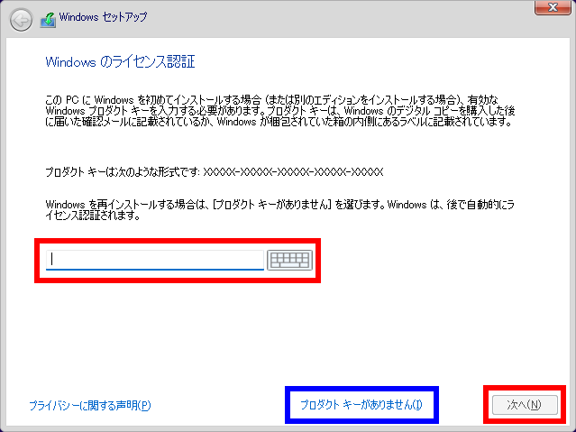 [ プロダクト キー ] を入力し、[ 次へ(N) ] をクリックします。