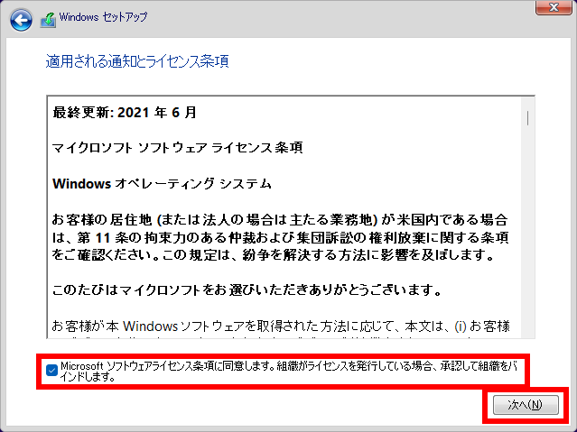 内容を確認し、 [ Microsoft ソフトウェアライセンス条項に同意します。~ ] 欄 → [ 次へ(N) ] の順にクリックします 。