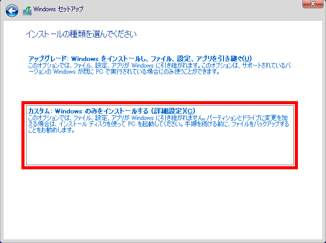 アップグレードではないので、 [ カスタム: Windows のみをインストールする ( 詳細設定 ) (C) ] をクリックします。