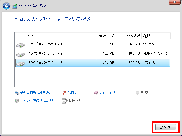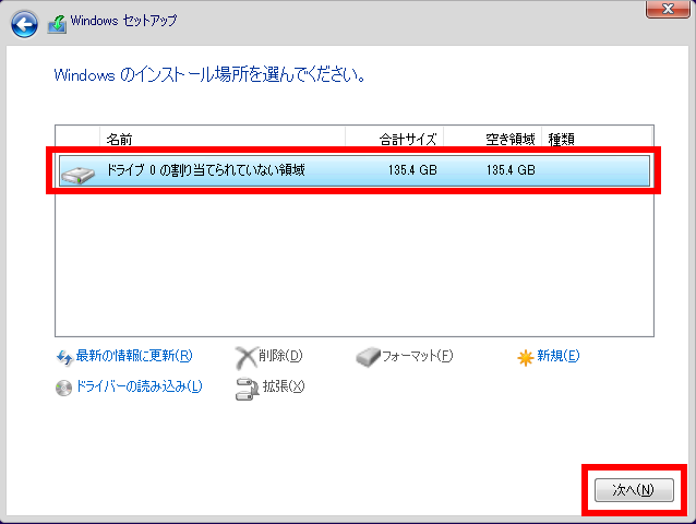 [ ドライブ 0 の割り当てられていない領域 ] を選択し、 [ 次へ(N) ] をクリックします。