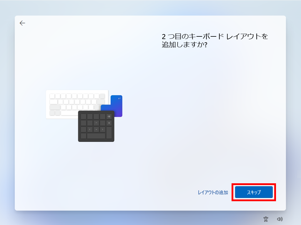 18. 「 2 つ目のキーボードレイアウトを追加しますか? 」 画面が表示されます。