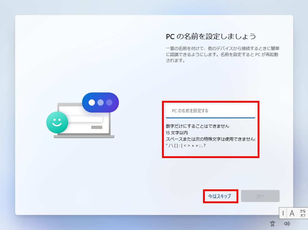 20. 「 PC の名前を設定しましょう 」 画面が表示されます。