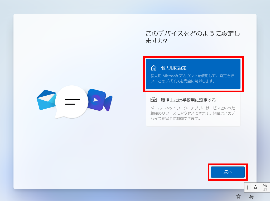 ここでは例として、 [ 個人用に設定 ] を選択し [ 次へ ] をクリックします。