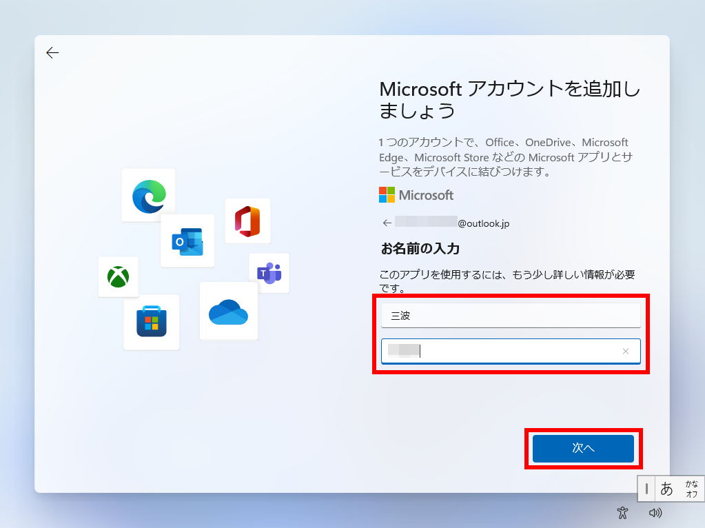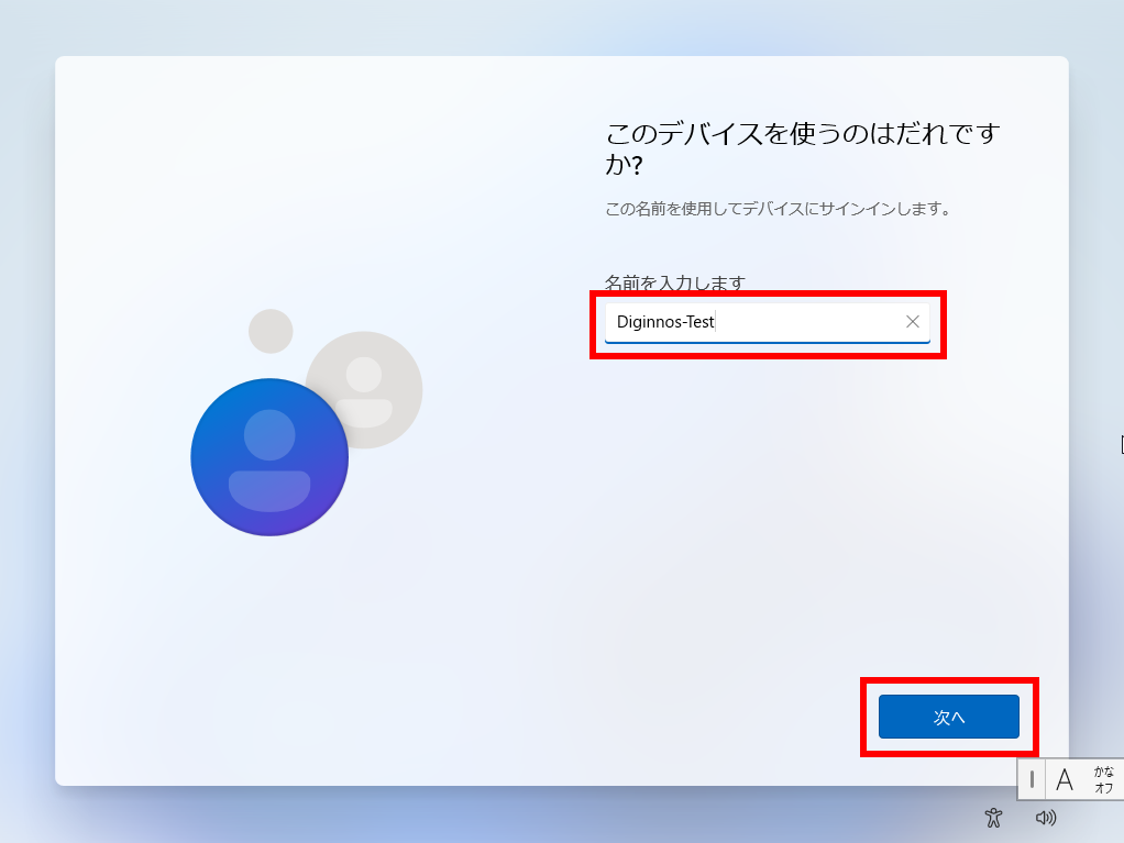 [ 姓名 ] を入力し、 [ 次へ ] をクリックします。