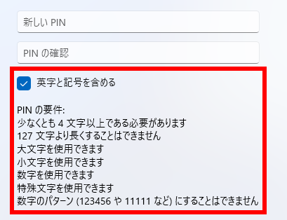 [ PIN の要件 ] をクリックすると、要件を確認することができます。
