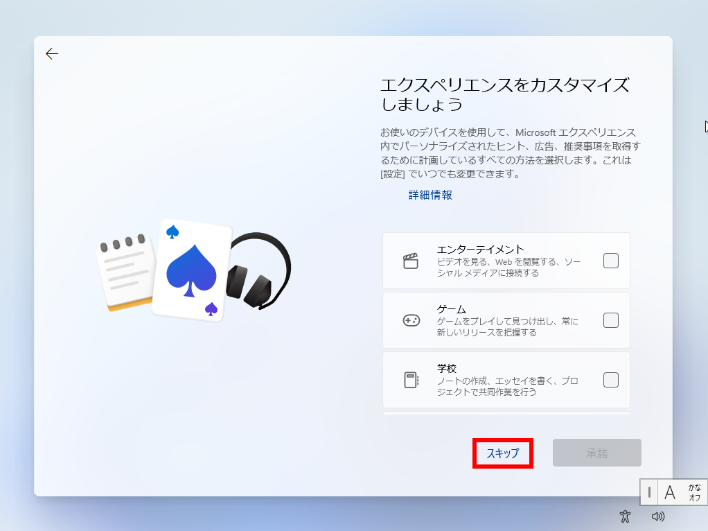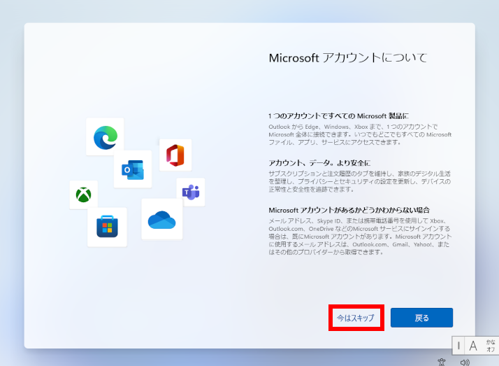 ここでは例として、 [ 今はスキップ ] をクリックします。