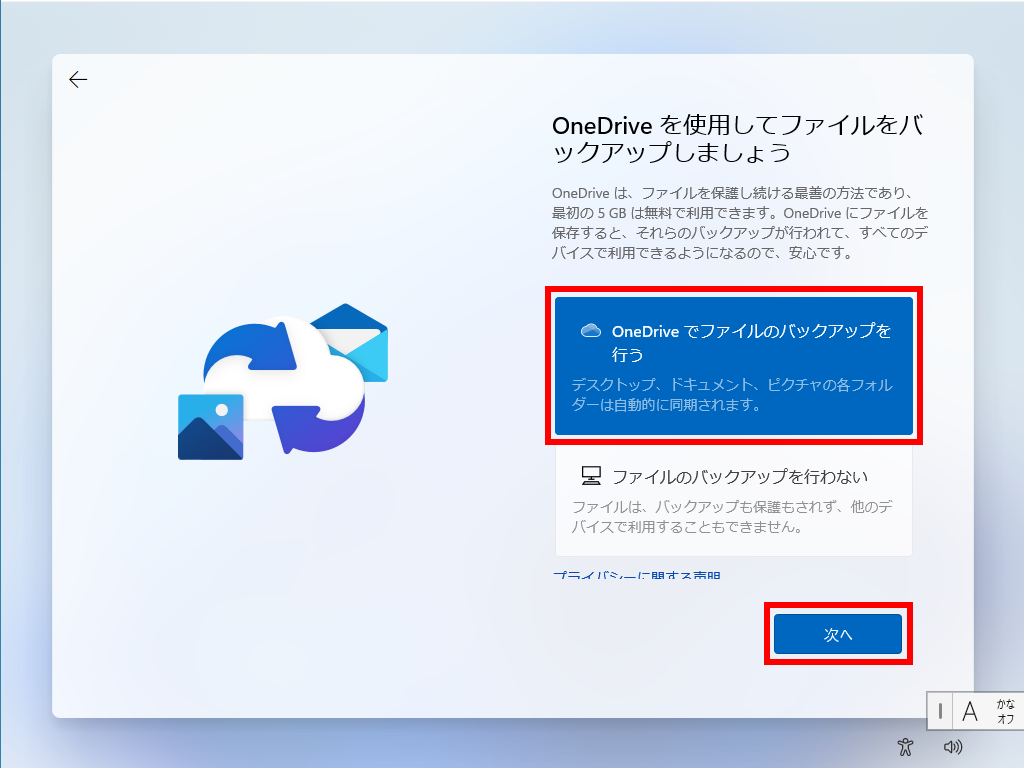 ここでは例として、[ OneDrive でファイルのバックアップを行う ] を選択し、[ 次へ ] をクリックします。