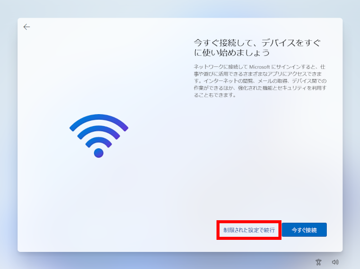 ネットワークに接続していませんので、 [ 制限された設定で続行 ] をクリックします。
