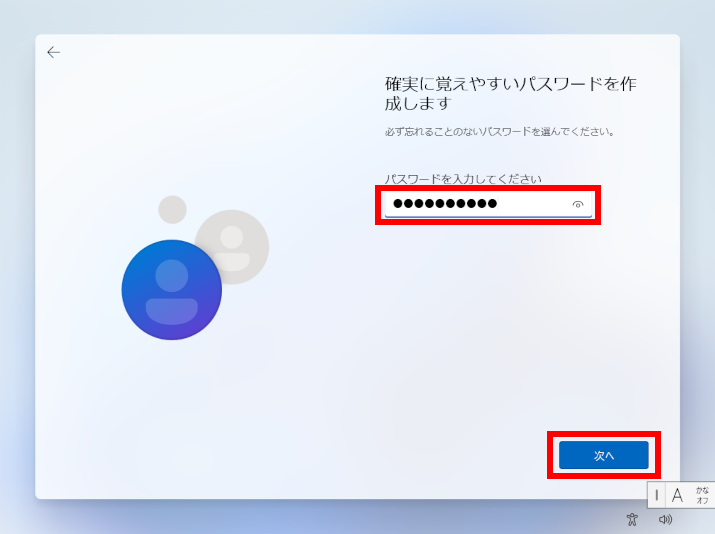 22. 「 確実に覚えやすいパスワードを作成します 」 画面が表示されます。