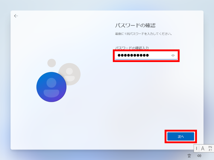 もう一度同じパスワードを入力し、 [ 次へ ] をクリックします。