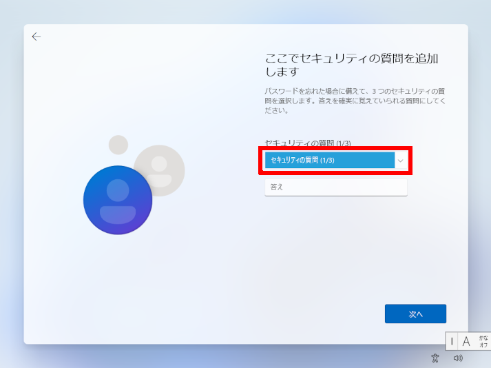 24. 「 このアカウントのセキュリティの質問を作成します 」 画面が表示されます。