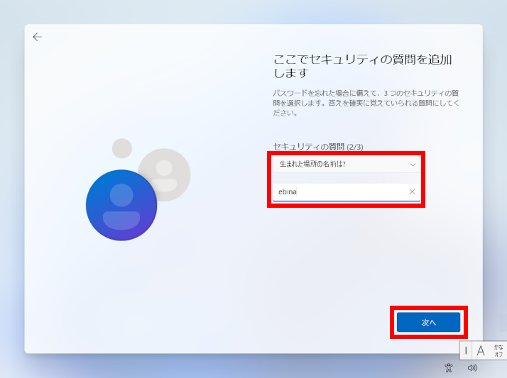 ※ここでは例として、 「 生まれた場所の名前は? 」 の問いに [ ebina ] と答えています。