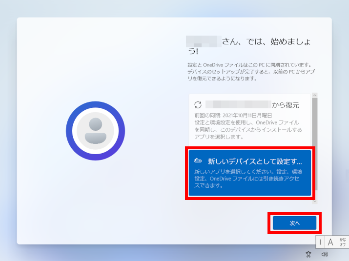 「 Microsoft アカウントに紐づいた PC からの復元 」 または 「 新しいデバイスとして設定する 」 を選択し、 [ 次へ ] をクリックします。