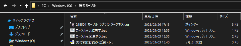 「カーソルを変更する.bat」を開くと、マウスカーソルデザインが変更されます。